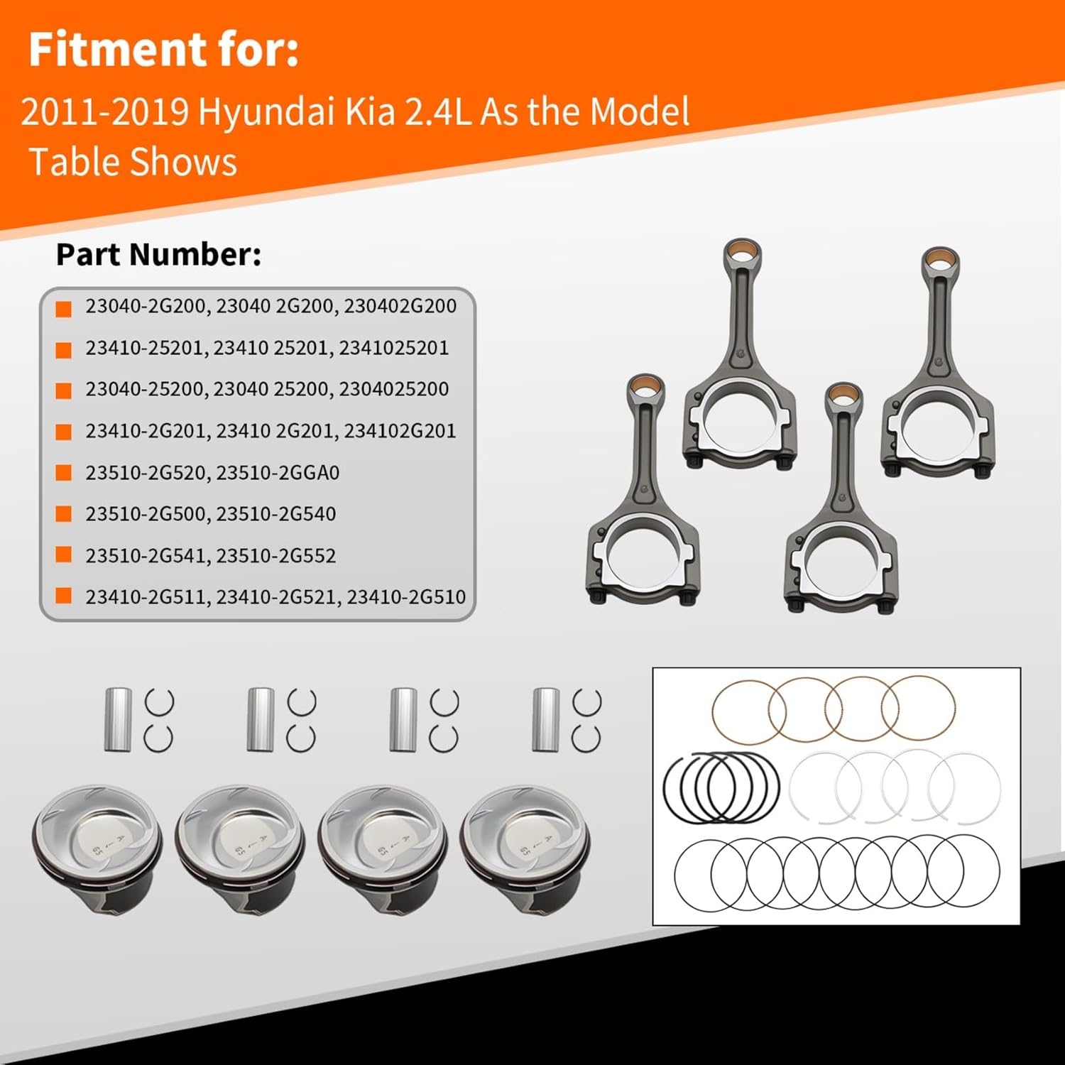 Excellent Performance: Each piston and rod is precision-machined to maintain exact balance and consistent power—stronger pull, quieter working, and a noticeably more confident power response mile after mile.Vehicle Compatibility:Compatible with Santa Fe 2.4L 2011-2019Compatible with Sonata 2.4L 2011-2019Compatible with Tucson 2.4L 2014-2015 2019Compatible with Optima 2.4L 2011-2019Compatible with EX/LX/SXL Sport 2.4L 2011-2019Replacement Code:23040-2G200 / 23410-25201 / 23040-25200 / 23410-2G201/23510-2G500 / 23510-2G540 / 23510-2G541 / 23510-2G552/23410-2G521 / 23410-2G510 / 23510-2G520 / 23410-2G511Vehicle Model Confirmation: Before making a purchase, kindly ensure that you have identified the correct vehicle model to avoid mismatching products