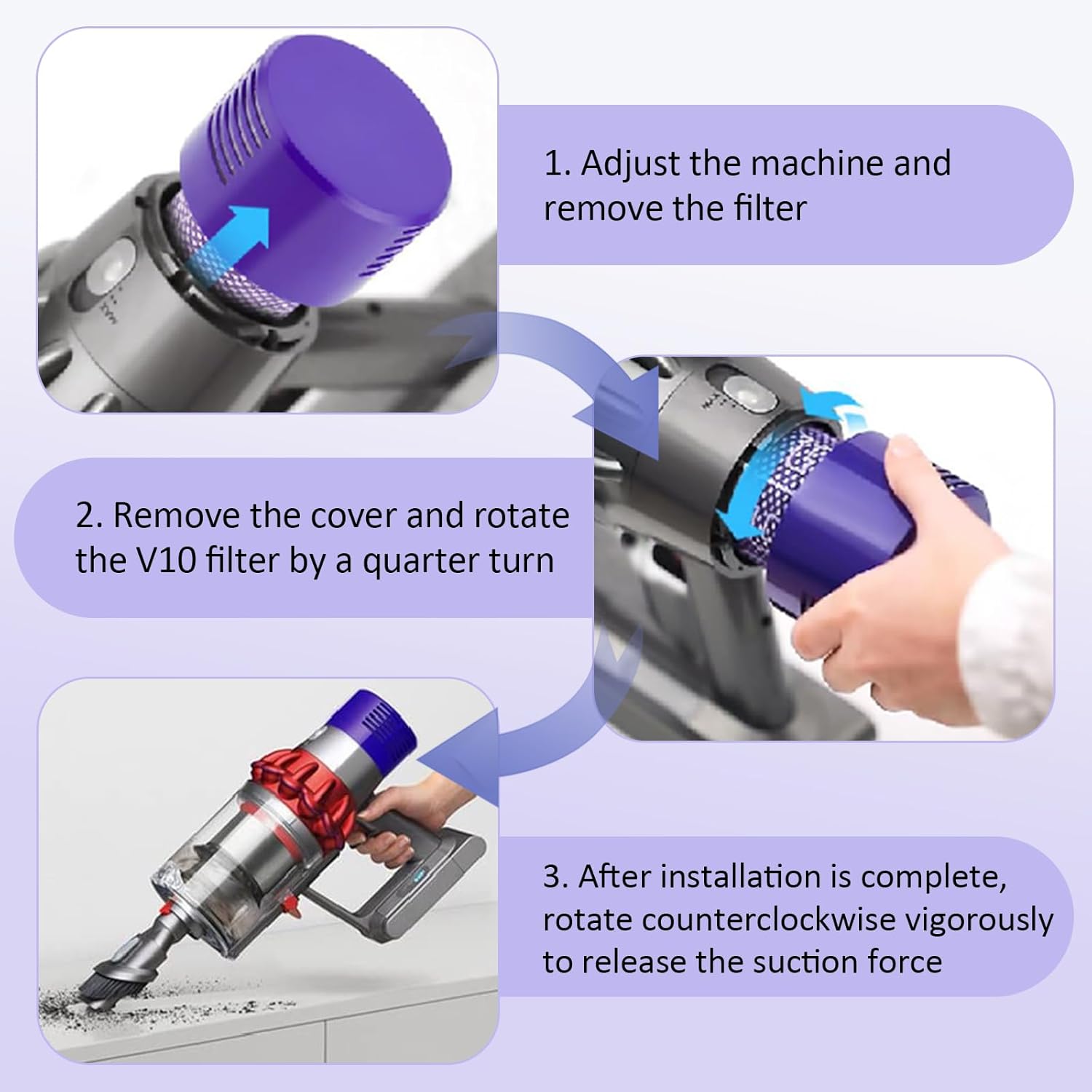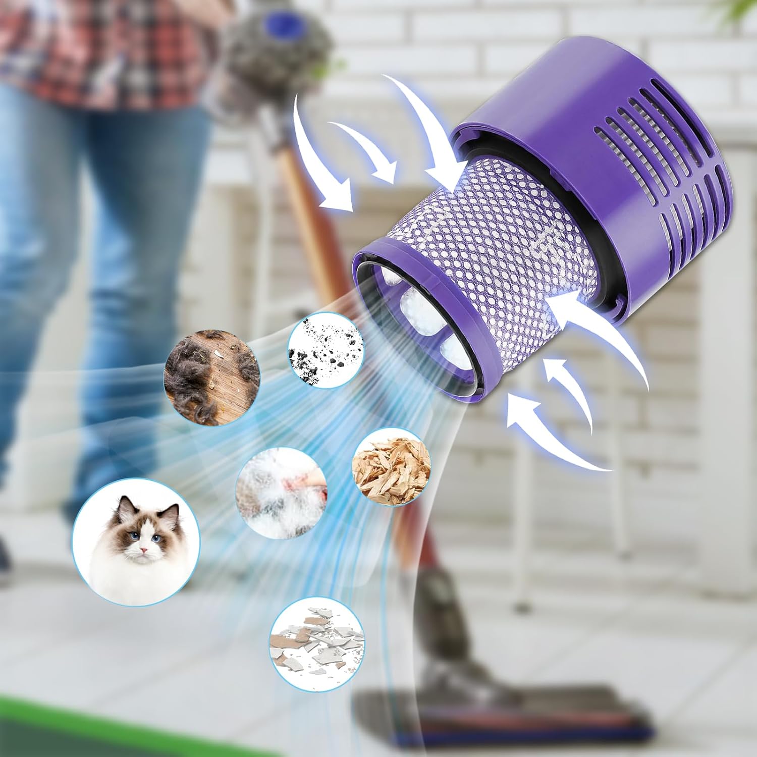 (Accurate compatibility)Perfect fit for V10 Cyclone Series,V10 Total Clean, Cyclone V10 Animal, Cyclone V10 Absolute,SV12, Replaces Part # 969082-01.It's easy to buy the wrong one, please check the incorrect models in the product image. NOTE: Not Fit for V11. (High efficency)this v10 filter replacements are 99.97% effective in clean and fresh air in your home. Works great as the original filters.Adopting two-in-one design, our v10 filter help your vacuum run at peak again. (Washable and reusable)filters for V10 series, just enjoy same performance as original ones. A new v10 filters helps create a cleaner, healthier home. (Easy to Install)Free your hands from the complicated replacement steps. No extra tools needed. (Valuable Bundle)Cost-effective package which includes 2 pack of V10 vacuum replacement filters for the right replacement pack whenever you need it.