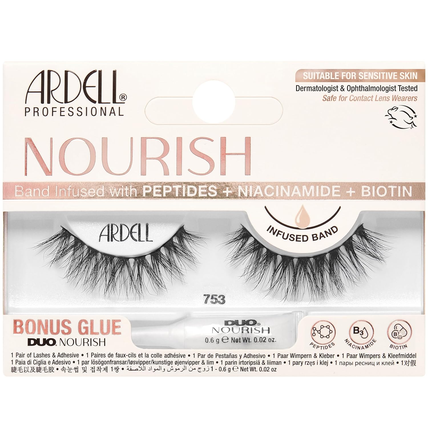 Ardell Nourish Lashes in Style 752 false eyelashes bring bold curves and plush fullness with a rounded, center-focused shape that brightens and defines. These strip lashes feature fluffy volume and medium length, designed with wispy lashes that fan out in a captivating curl. The nourishing band is infused with peptides, niacinamide, and biotin to condition as you wear. Paired with DUO Nourish Glue, these fake lashes transform every gaze into a statement of dark glamour.
