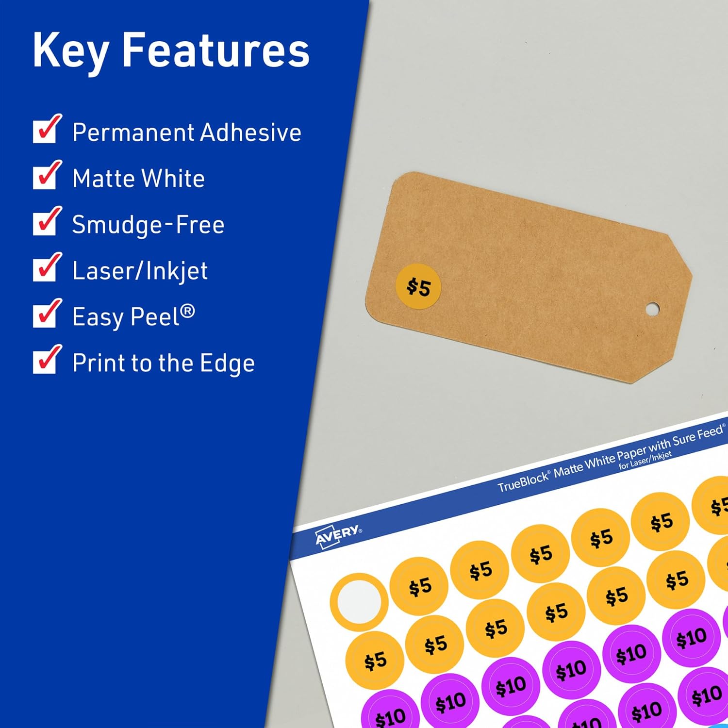Easily update old information and create mailing seals, candle labels, pricing labels, and more with Avery TrueBlock 1-1/4" diameter Matte White Round Labels. Easily revise old labels with Avery TrueBlock technology. The proprietary TrueBlock feature completely covers up markings and printing so that none of your old data shows through. This also provides better contrast for your new print to stand out on a completely white background. The permanent adhesive makes sure that your labels stick and stay to a variety of surfaces without peeling, curling, or falling off. Avery round labels are carefully constructed with top features to provide the best results. Sure Feed technology reduces jams and smudges by creating a more reliable feed through your printer. The print-to-the-edge layout lets you print beautiful full-bleed designs that fill each blank sticker to the edge. The patented Easy Peel label design makes these labels easy to peel and quick to apply. Just bend the label sheet, peel off your labels and fold the sheet back flat. Easily customize soap labels, product labels, round spice labels, mason jar labels, and more with your own art, symbols, and messaging by using the templates and designs on the Avery website.
